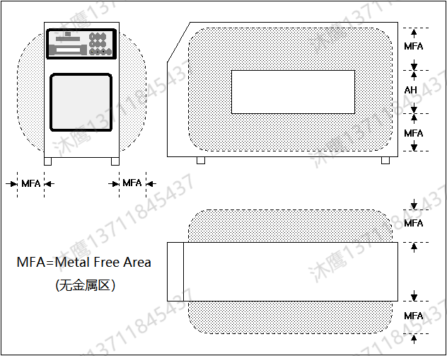 金屬探測器的電磁信號場一般位于探測頭隔離或防護(hù)好的內(nèi)部,但是電磁信號會有一定的發(fā)散性,所以在檢測通道兩側(cè)會存在一個“無金屬區(qū)”。通常當(dāng)金屬探測器頻率為低頻小于200KHz時,“無金屬區(qū)”約等于檢測通道高度的尺寸;當(dāng)金屬探測器頻率為高頻時,“無金屬區(qū)”約等于檢測通道高度的1.5倍。該區(qū)域不允許存在金屬。